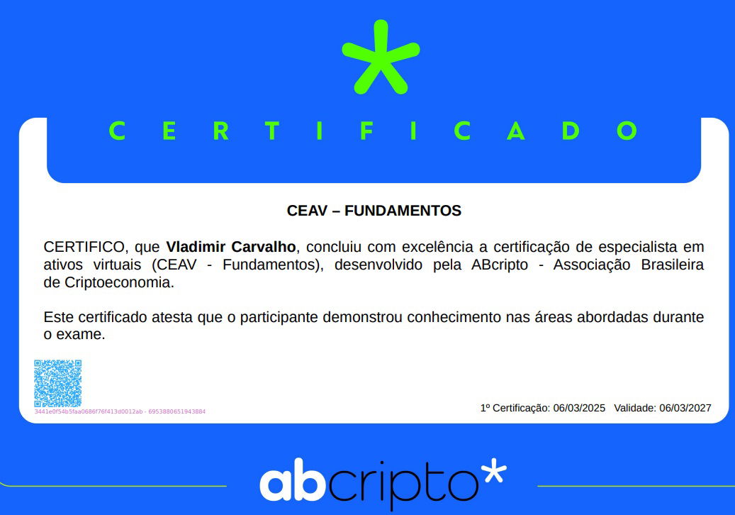 • In 2019, I started learning about and investing in Bitcoin and other cryptocurrencies, and, in 2025, I became certified as a Crypto Assets Specialist by the ABCripto (Brazilian Crypto-economy Association), marking a milestone in my professional journey.